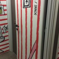フィレンツェの中央市場は1階がほとんど閉店していても2階のおしゃれな屋台村のようなレストランは開いています。14時~17時などというレストラン閉店時間でもとってもおいしいお料理が食べられる場所です。しかも注文は写真や目の前の実物を指させばいいので、旅行者にはとっても便利な所です。1階の日本人向けのお店も遅くまで(昼過ぎ)開いているので、お土産を買って2階へ上がり、食事というのがいいと思います。そしてトイレ、とてもおしゃれな絵が描いてあって思わず写真を撮りました。が、近すぎて全体が撮れないので残念!