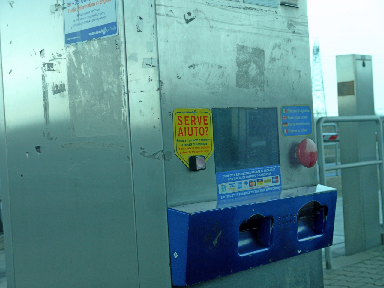 イタリアの高速道路は他の国よりは乗りやすい.まず入るときに日本と同様にカードを取る.そして降りるときにはなるべく有人のブースで支払いをすればいい.決してTELEPASSというETCのブースに入らないこと.カードのみのブースもあるが,カードがうまく読まれないと面倒なので,できれば有人ブースで払うとよい.有人でも現金のみでなくカードも可.http://www.autostrade.it/en/home