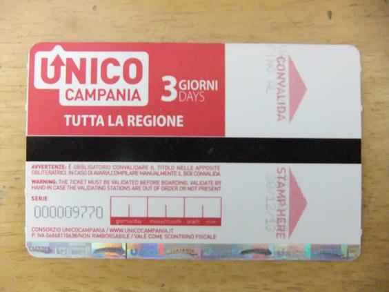 TUTTA LA REGIONEの3日券を利用しました。空港の観光案内所で32ユーロで購入。最初の2箇所は無料ですが、施設によってはカードの読み取り機の調子が悪いのか、3箇所~でも無料になったところがありました(サンテルモ城、ヌォーヴォ城)。交通機関としてはアリバス、市バス、地下鉄、ヴェスーヴィオ周遊鉄道(検札がなかったのでカードは提示していません)、フニコラーレに乗車しました。元は取れたと思います。
