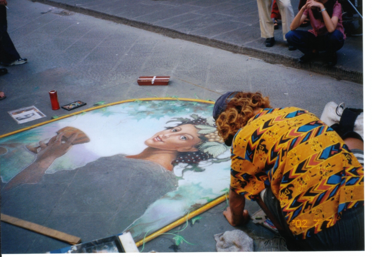 グーちゃんです。芸術の街「フィレンツェ」には、いっぱいアーティストがいるよ。路上で見かけたこのすばらしい「絵」!!すごいね、きれいだねって言ってたら「日本の人ですか?」って聞かれたの! なんとこの人は日本人だったの! 頑張れ!日本人アーティスト!!