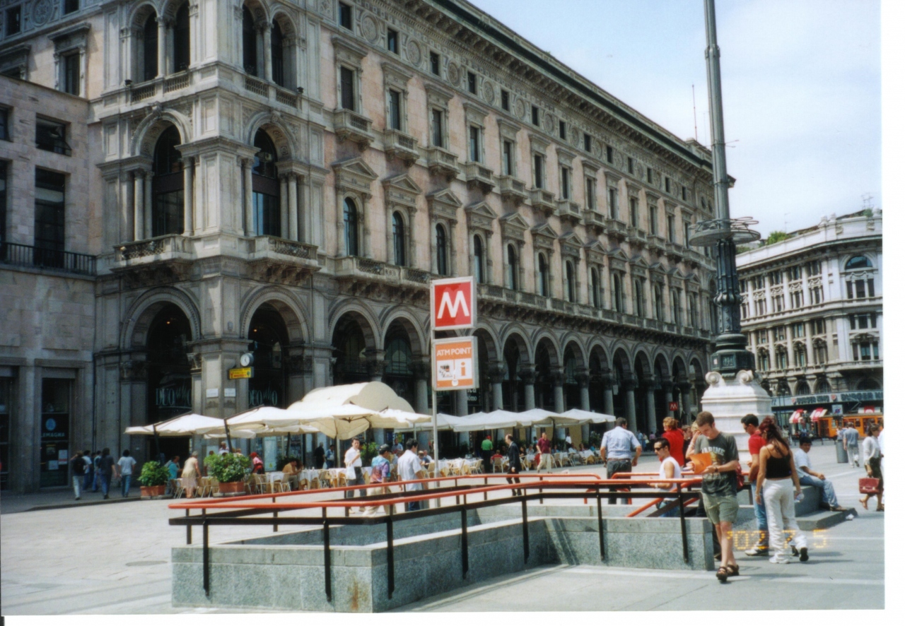 ミラノのドゥーモ前の広場なの。お腹すいたからマックに行こうと思ったら、このマークは地下鉄なんだって! 気をつけないと!!
