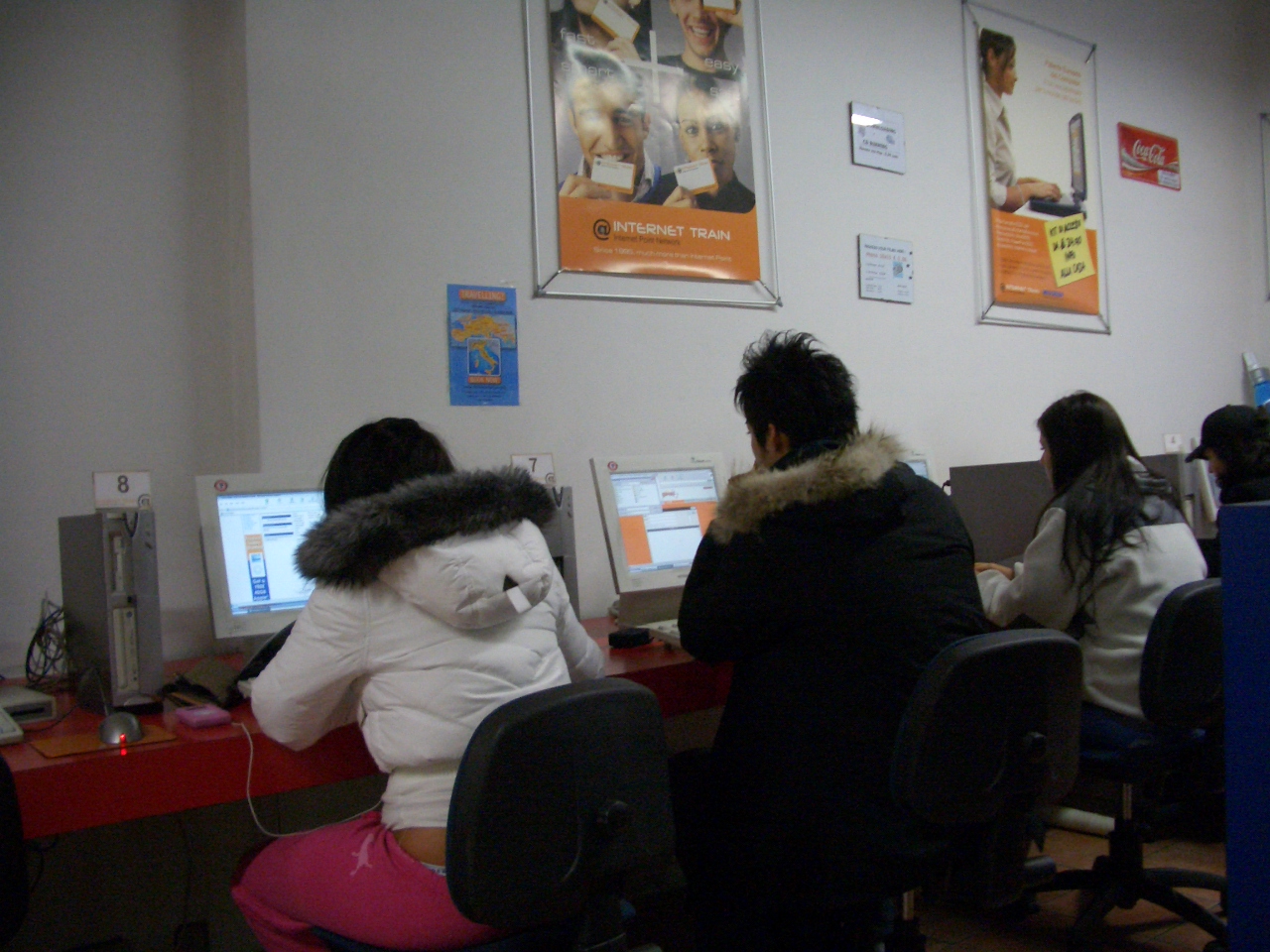写真データを自サーバにアップロードして,メディアの容量を増やそうと思っていたのですが,ディスクトップ上(おそらくハードディスク上のどこにも)にファイルを置くことができませんでした。利用するアプリは,もう一つのUSBメモリに入れていたため,(USBインターフィスは2つあるのですが,位置が近すぎるため,上手く差し込めませんでした。)諦めました。(ハブを持っていけばいいかも)そこで,Burning CD と書いてあったので,データをCDに焼いてもらおうとしたのですが,USBはデータが壊れやすいから無理だと言われました。(SDリーダ/ライタを持っていってたのですが)納得いかない説明でしたが,議論するには,面倒な事が多かったので,やめました。結局,メールだけ送りました。「使えない INTERNET TRAIN 」これが素直な感想です。というよりも,私が期待しすぎですね。(LAUGH) -