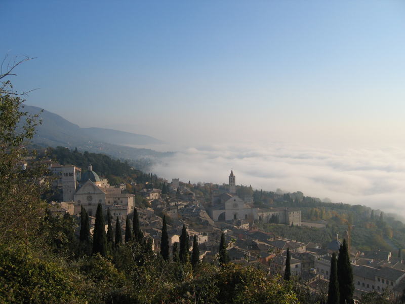 アッシジに着いた時に天気が悪くても決してガッカリしないで下さい。雲に覆われた町を歩いて、ロッカ・マッジョーレ(大要塞)まで行きましょう。そのうち雲が晴れて、雲上の町が現れるはずです。私はむしろ曇っていて良かったと思っています。