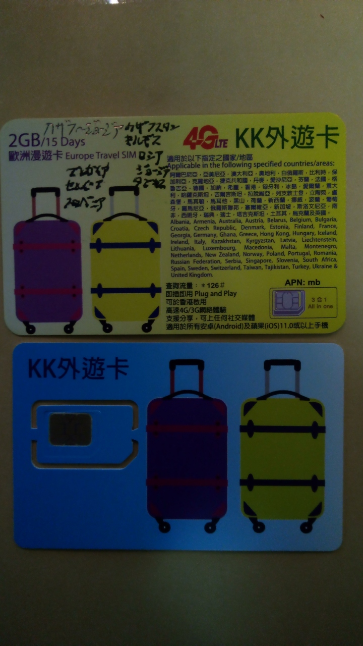 もう一枚のヨーロッパ周遊SIMより割高だが、特に中央アジアで使える周遊SIMは少ないので検討に値すると思う。(他にもオセアニアやガーナ・南アフリカ、帰国便の経由地にありがちなシンガポール・香港・台湾でも使える)