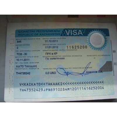 申請は2011年11月3日在キルギス、カザフスタン大使館において行いました。受領は1週間後となりましたが、7日、8日がキルギスの祝日、9日は水曜日でカザフスタン大使館の休館日でしたので、祝日を挟まなければもう少し早く受領できた可能性もあります。