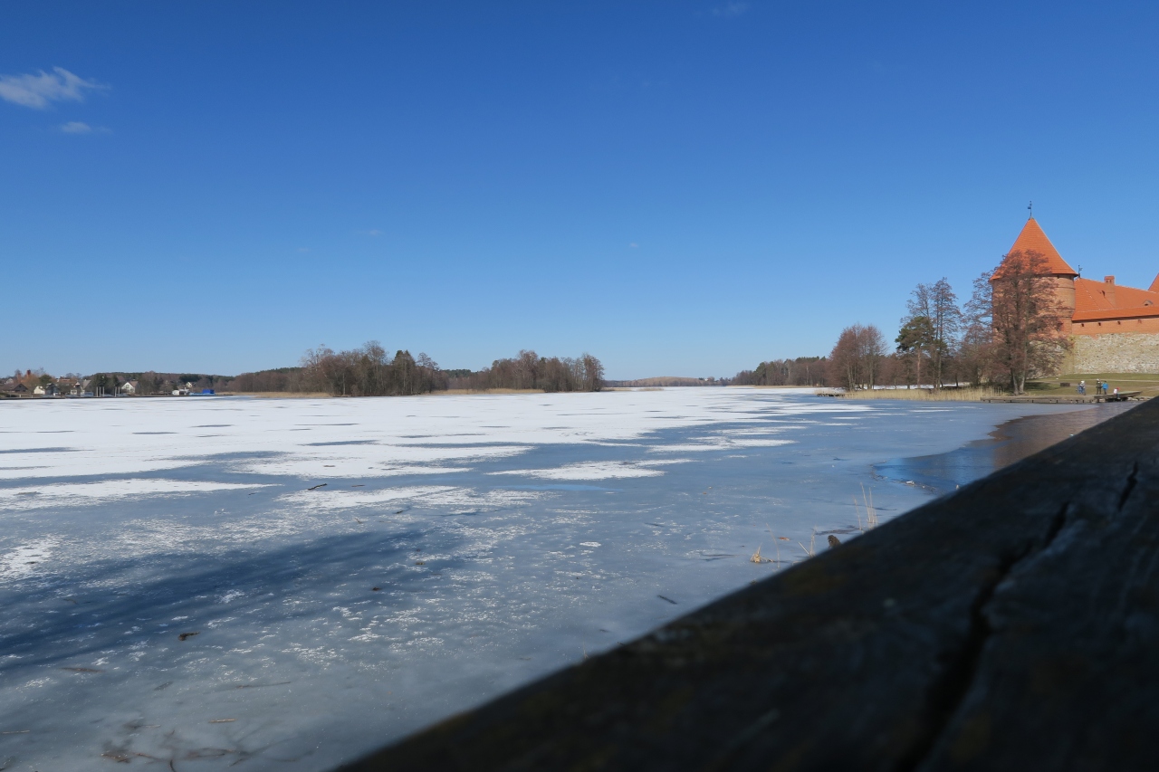 湖はほぼ全面凍結していました。 凍った湖を流れてくる風は冷たかった! 晴れていたし、この時期にしては暖かい日だったのですが、それでも寒かった! トラカイ城の周囲の道は、グジュグジュしていました。 靴の中と背中にホカロンを張りました。 それでも寒かったので、持参した100均で購入した使い捨ての雨具のパンツをはきました。 風よけになり、かなり効果的! トラカイ城の周辺を歩いたら、雨具のパンツの足元が泥だらけになっていたので、バスに乗る前に脱いで捨てました。 靴はゴアテックスだったので問題ありませんでした。
