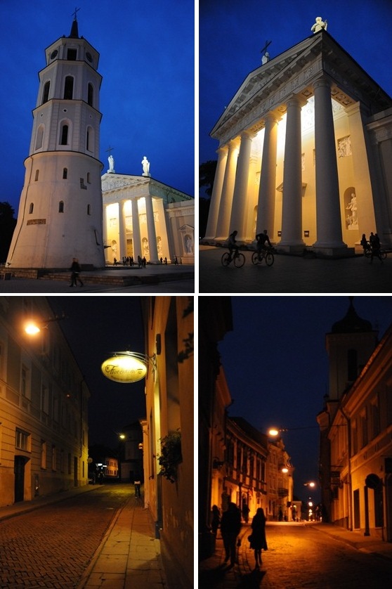 ヴィリニュス旧市街地の北端近くにある大聖堂(アルキカテドゥラ)は、夕暮れから夜にかけてはライトアップされていい風情。