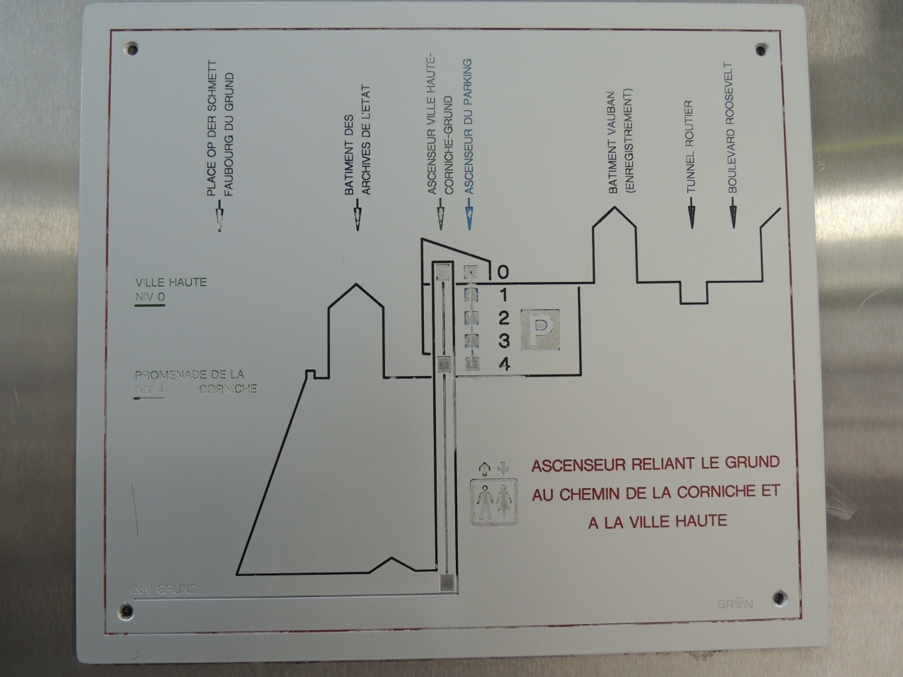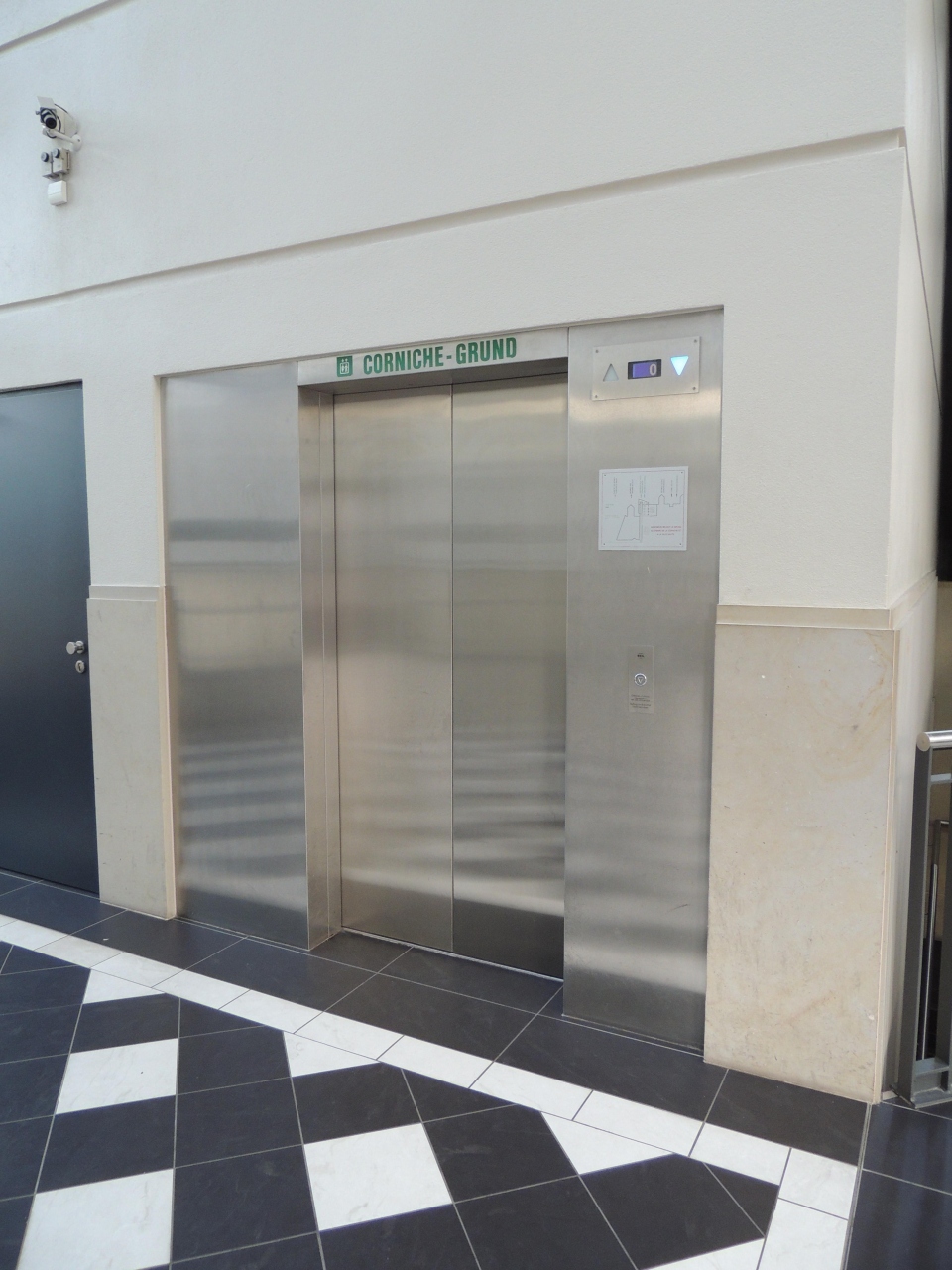 エスプリ広場にあります。無料のエレベーターで、誰でも使用可。乗り場は、上は裁判所の前、下はグルント。グルントから旧市街へ毎日坂を上ったり降りたりするのは大変だよねえ。これは便利。エレベーターは14人乗りで、高さは41m。ただグルントに降りてからの通路は夜は一人で通るのは怖いかも。。。