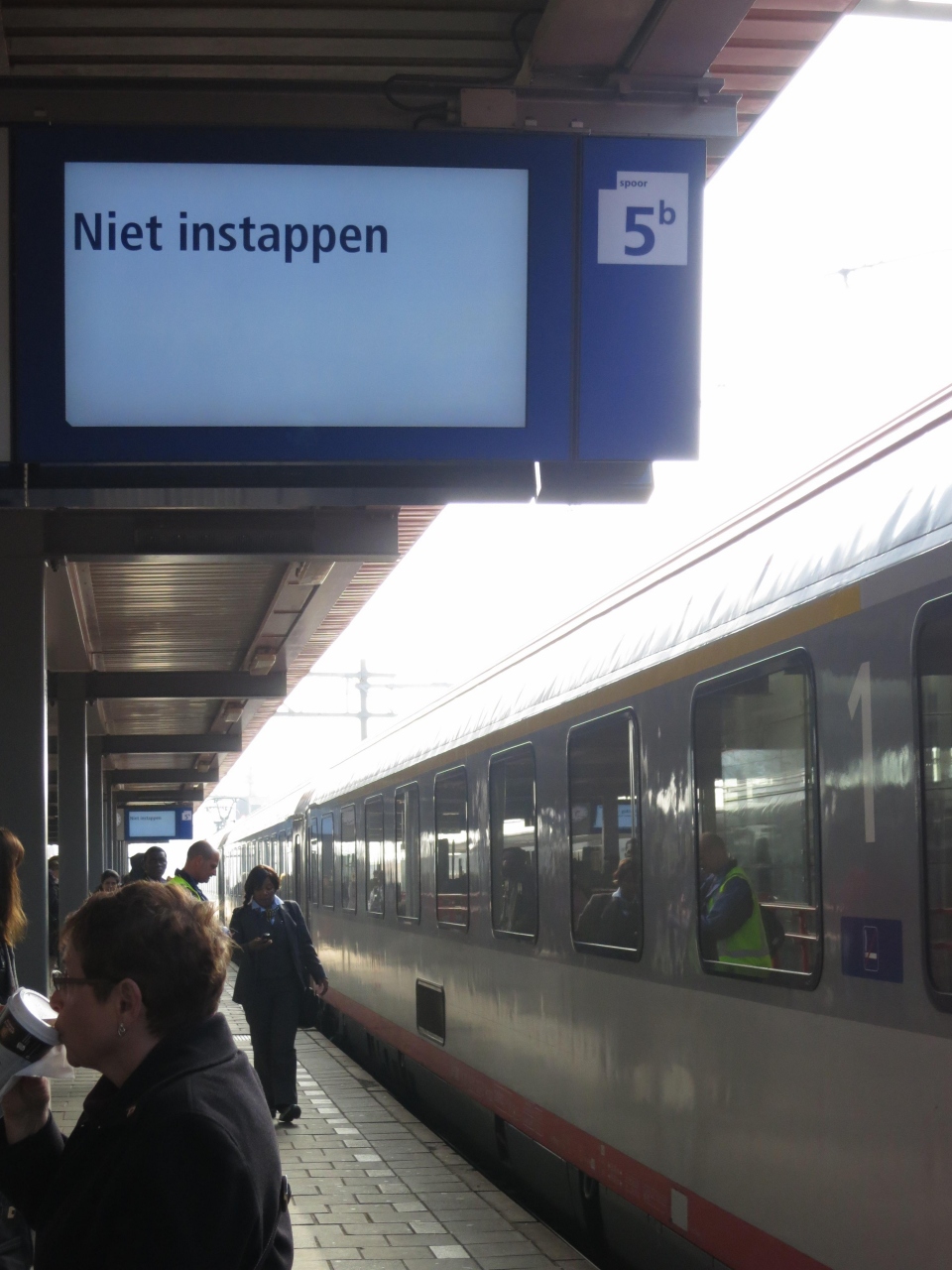 ・ブリュッセル行きのIntercity列車をスキポール空港から乗車しましたが、ロッテルダムを過ぎた後に、オランダ語のアナウンスがありました。電車はもう次にで止まるので、次の駅で降りてくださいということでした。行き止りの駅で降りまして、寒い中ホームでじっと待っていました。次の列車が1時間後に来ました。しかし、電車が運行しない説明はありませんでした。