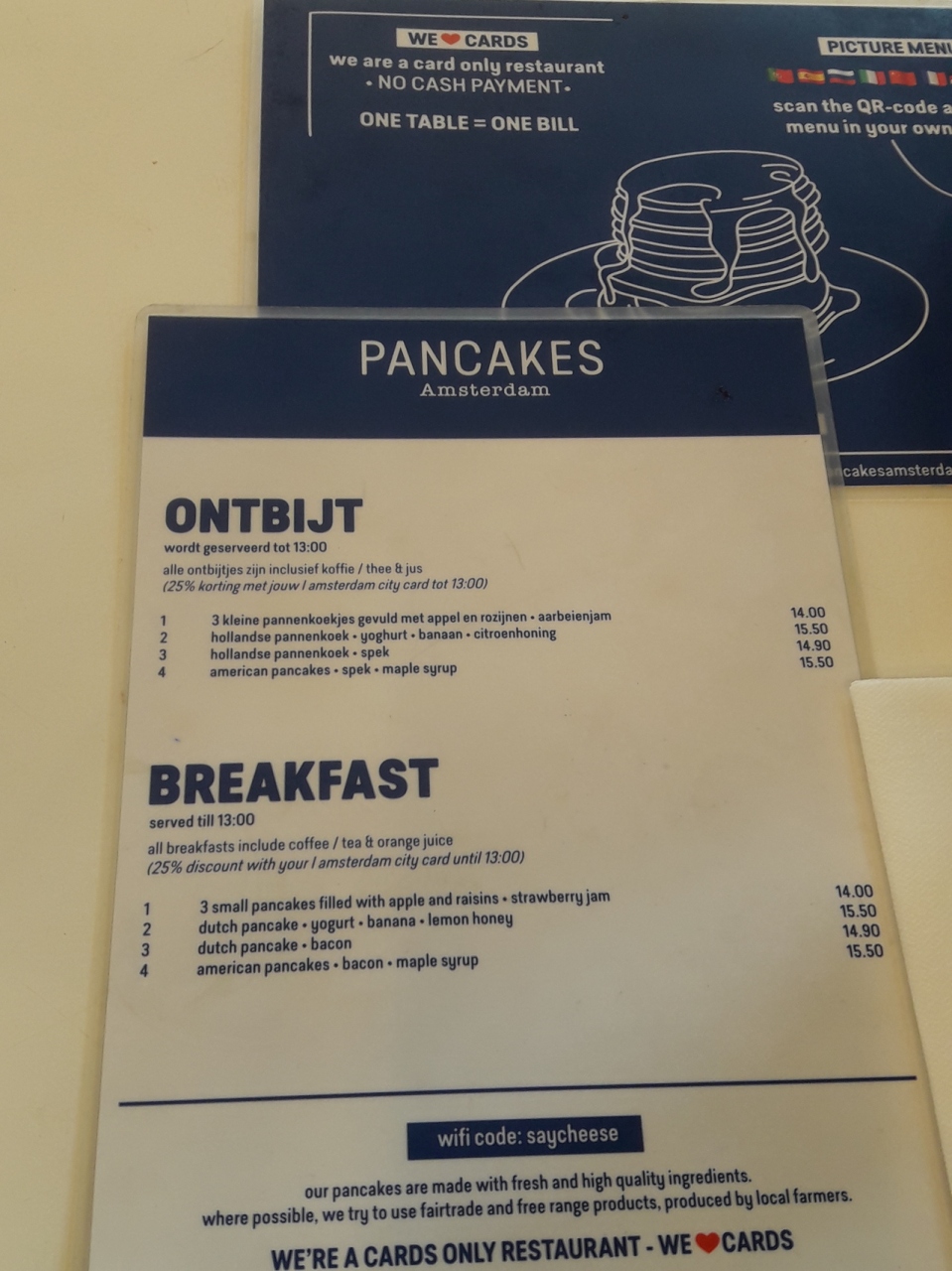 アムステルダムでは、現金が使えずカードのみで決済をするお店が増えています。駅近くのパンケーキのお店、旧教会(12ユーロ)はカードのみでした。スーパーで数ユーロでも普通にカード使ってます。