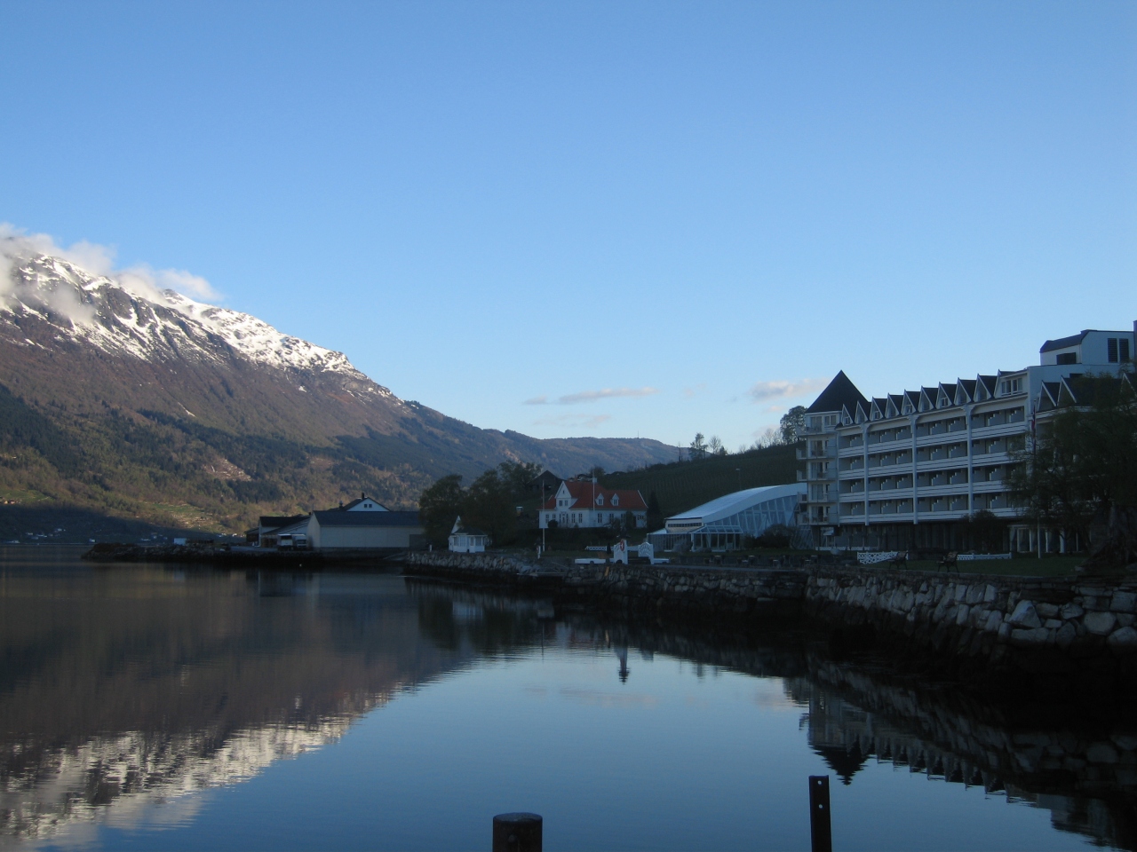 フィヨルドの両側の山にはまだ雪が多く残っています。