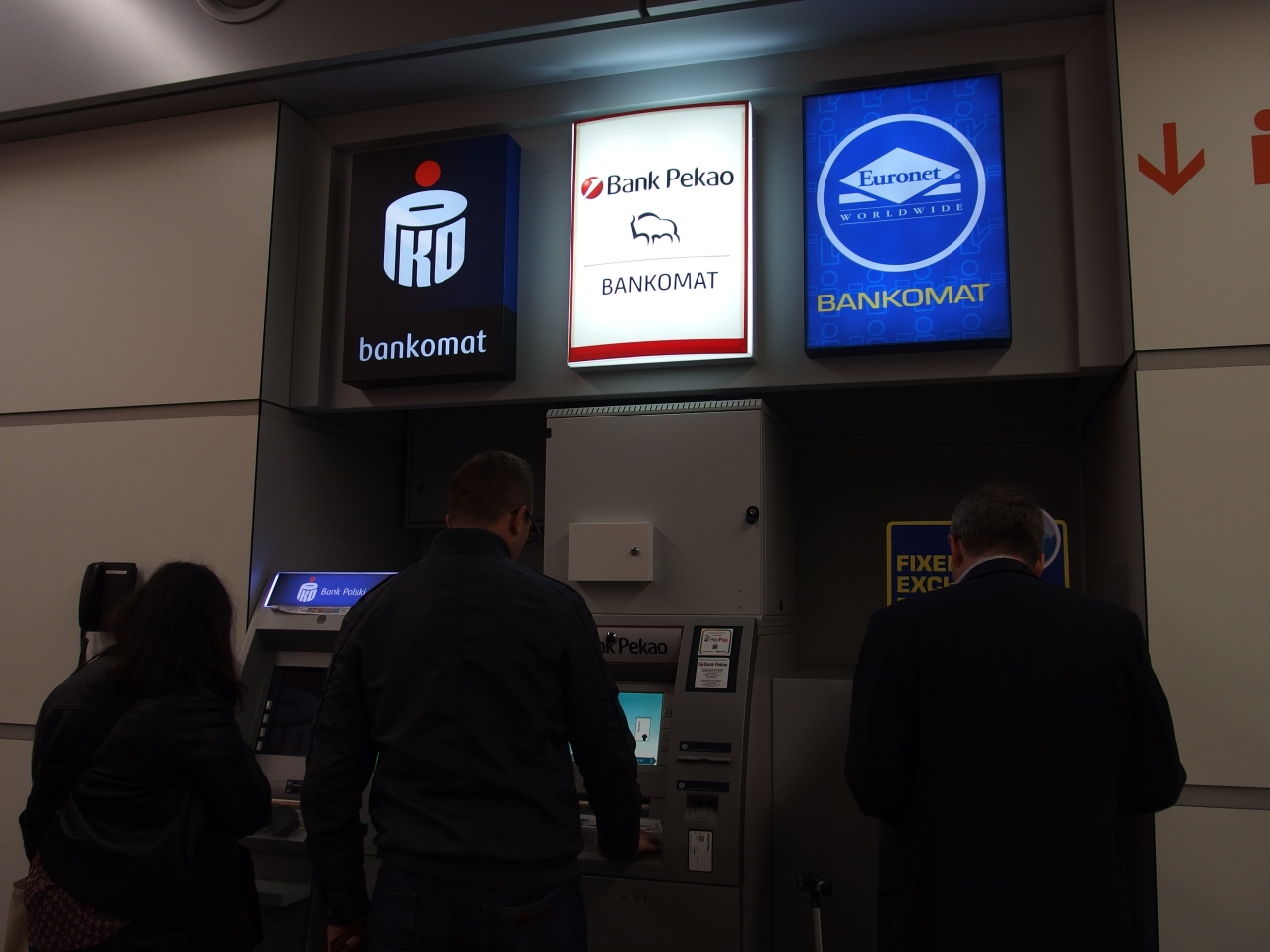 21時30分ワルシャワ国際に到着。両替を探していると、出口出てありましたが、ATMもありました。ただ、場所が出口の左側で少しわかりにくい。広くはないので、誰かに聞けば教えてくれると思います。mastercardのクレカで銀行のキャッシング機能を利用しての引き出し。カード入れるとenglishを選ぶ事ができるので、言語をきりかえる。そして、指示通り進んでゆき、100PLNを引き出すことができた。ATMは手数料も少な目で、時間帯も比較的長いし、便利なのだが、一つだけ不便なのが大きなお金(小さい札なしの)が出てくるので、結果、電車の切符は100PLNでは購入できず、大変困った。
