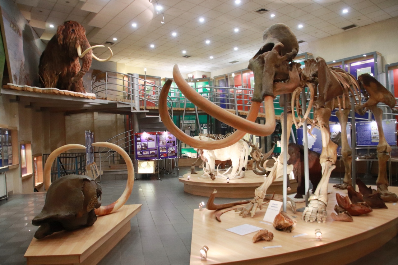 ヤクーツク市内の観光みどころはほとんど徒歩で行けますが、マンモス博物館はやや離れているのでバスが便利です。 市役所の前の「中央」バス停やレーニン広場のバス停から17番バスに乗るとよいです。 マンモス博物館(ロシア語で「ムゼイ・マーモンタ」)はヤクーツク大学(略して「クフェン」)の中にあります。 大学の建物の中でも向かって左端にあるので、バス停を降りたら、建物にそって少し戻ることになります。 入口の写真を参照ください。 マンモス博物館は4階ですが、その下の1~3階のヤクーツク地方考古学歴史民俗博物館も面白いです。 マンモス博物館だけであれば、廊下の階段で3階まで上がると入口があります。 博物館の展示室は1室で、入場料は部屋の入口にいる係員に払いました。