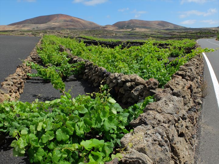 栽培しているブドウが根こそぎ倒れないように、火山岩で囲ってある風景は一種独特。