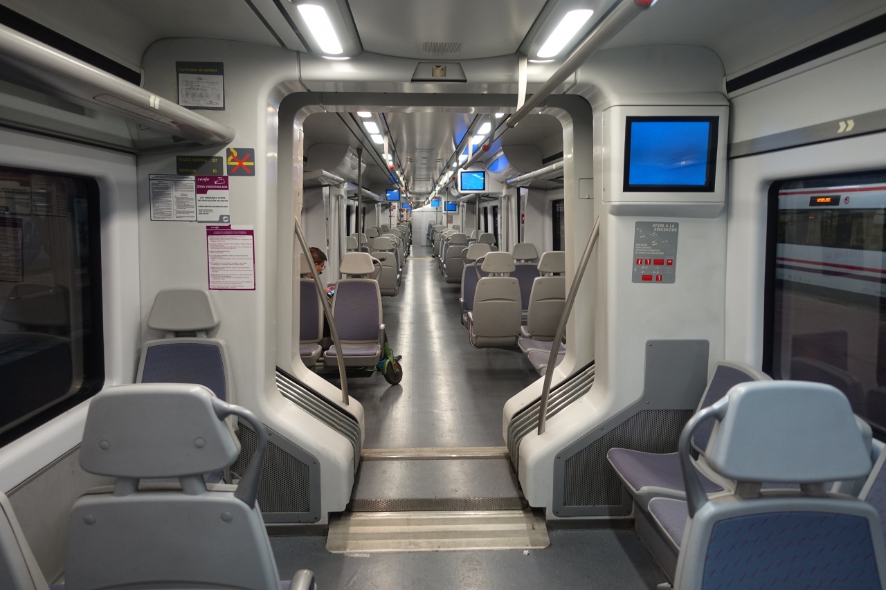 夜遅くにバラハス空港到着というフライトだったので、市内のホテルにチェックインするまでの移動が心配でした。空港からソル駅までセルカニアスに乗車。深夜ということもありかなりすいていました。人混みも気をつけないとですが、人が極端に少ないのも不安になります。