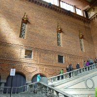 ストックホルムの必見の場所・ノーベル賞式典の行われる市庁舎。内部見学は時間の決まったガイドツアーでしかできない。地球の歩き方に「16時」があると書いていたが、偶々ガムラスタンの観光案内所で聞いたら「今日は15時が最終です」と言われた。時計を見るとあと15分しかない。家内と走った、走った。切符売り場に着いたら既に15時を3,4分超えていた。「ツアーを追いかけるなら入れてやる」と言われ、お金を払おうとしたら、何人か並んでいた。催促がましくカードを手に持ってヒラヒラさせたら、「カードはこっちで…」と言って、別のレジ?に回してくれた。お蔭でサッと、それもちゃっかり「シニア割引」までしてくれて、切符を出して、既に出発していたツアーの所まで案内してくれた。まだ最初の部屋で説明中だったから、完全にセーフと同じ結果だった。カードをちらつかせた?のがよかったなぁ。もっとも街中でではなく、市庁舎の切符売り場だから安心してやったことですがね。
