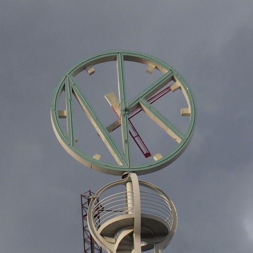 ビルの上に掲げてあるので、上を見上げてみてください! -