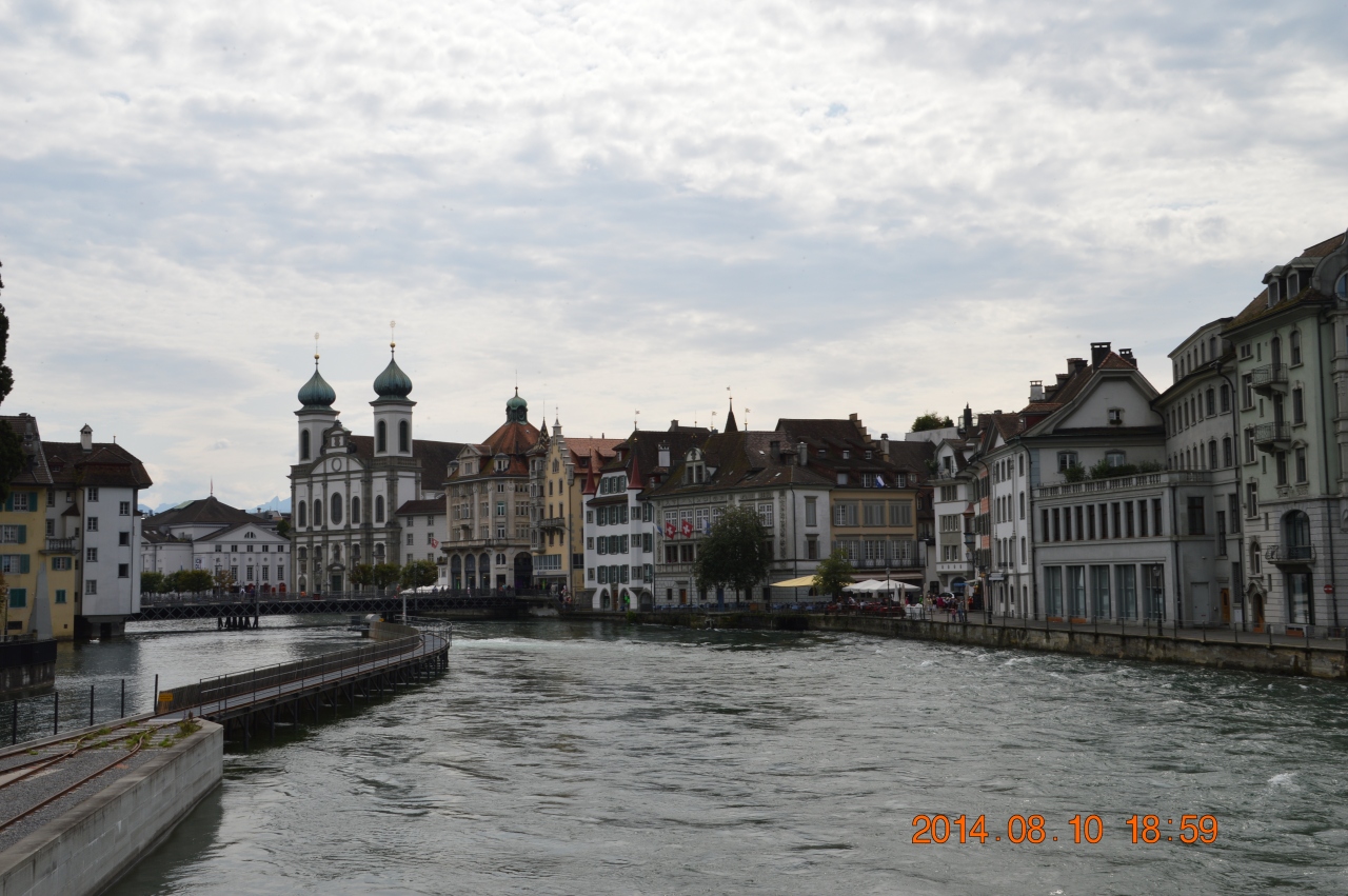 2014年8月10日にベルンから鉄道で日帰りしました。快晴のルツェルンは半袖1枚でカペル橋、ライオン碑、ムゼック城壁などを巡り、ロイス川のほとりでゆっくりと食事。隣のテーブルでは半袖姿の小さな女の子を連れた家族が食事しており、同じものをオーダーしました。