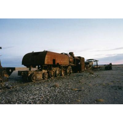 ボリビア、塩湖のあるウユニの町外れに列車の墓場があります。