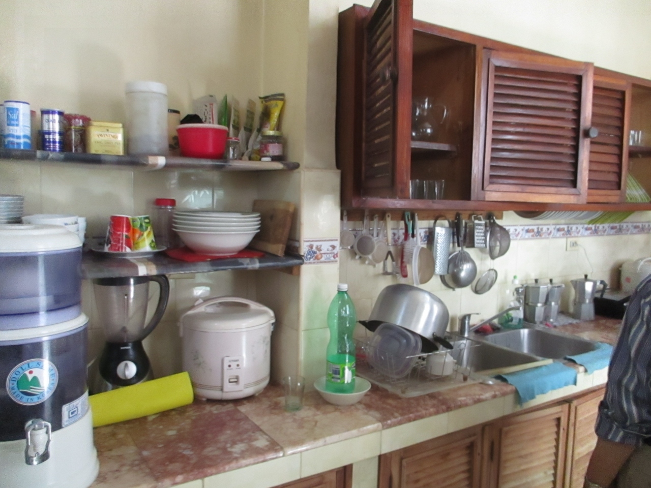 説明の後、台所やダイニングルームを見学しましたが、家の中の道具や家電製品も古いものが大切に使われ、壊れても得意な人が修理して使っているそうで、棚なども手作り感いっぱいでした。
