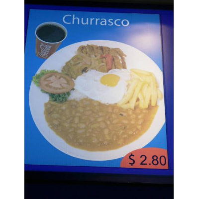 エクアドルは南米の中でも物価が安く生活しやすい。Churrascoというポテト、ステーキ、豆、目玉焼き、ライス、コーラ付きのセットは2.8米ドル・330円。チキン料理だけなら1.3米ドル・150円、チキン、ポテト、スープのセットが2.25米ドル・270円と手頃で味も悪くない。Churrascoなどのセットメニューを販売するレストランはキトにたくさんある。