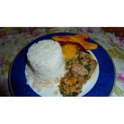 エクアドルの一般家庭の夕食。魚の煮込みエクアドル風と調理用バナナ(通称ベルデ{