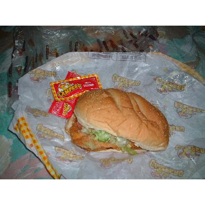 これは書くまでもないのですが、グアテマラが誇るフライドチキンのファーストフードです。首都圏にしかないので、田舎から都会へ出てきたら食べたいものNO1。アメリカからグアテマラへ里帰りしてきた人は、これを買ってアメリカへ・・・。(飛行機の中でもにおいが充満しています。)あの世界的・・フライドチキンの進出を許さなかったグアテマラの愛する味なのです。写真はサンドイッチ。クリスピーでお野菜もたっぷり入りおいしいです。