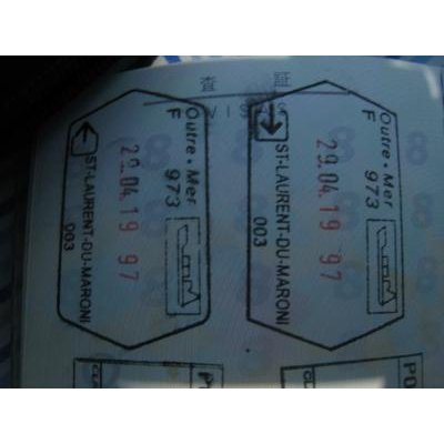 スリナムのパラマリボから日帰りで仏領ギアナの国境の町まで行ってきました。アクセスですが、パラマリボからスリナム側の国境の町までバスを用いました。スリナム側のイミグレーションは、ちょっと離れていたのでタクシーを使いました。国境はボートをチャーターして渡りました。写真は仏領ギアナのスタンプです。