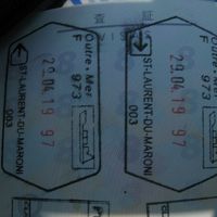 スリナムのパラマリボから日帰りで仏領ギアナの国境の町まで行ってきました。アクセスですが、パラマリボからスリナム側の国境の町までバスを用いました。スリナム側のイミグレーションは、ちょっと離れていたのでタクシーを使いました。国境はボートをチャーターして渡りました。写真は仏領ギアナのスタンプです。