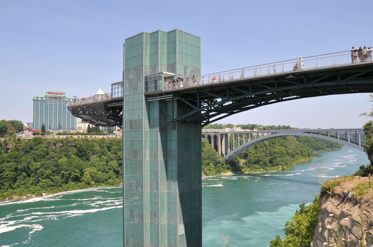 ナイアガラの滝付近のトイレ情報です。公衆トイレはありませんが、ホテルやショッピングモール内に無料のトイレがあります。またビジターセンターの1階にも無料で使えるきれいなトイレがありました。霧の乙女号の乗り場は展望台からエレベーターを降りて裏にまわったところにあります。
