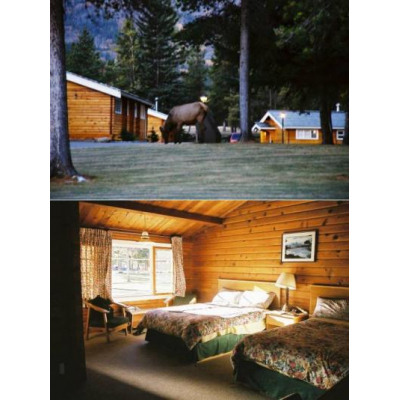 ジャスパー郊外アサバスカリバーの川岸にあるカナディアンロッキーらしいログキャビンの宿。