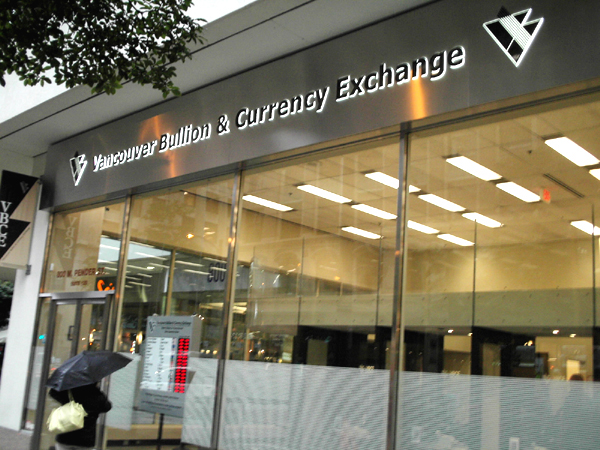 旅行出発時に手元にちょっとでもキャッシュ(カナダ$)がある方で、バンクーバーに到着後、ダウンタウンに移動するまで両替を待てる方には、こちら、Vancouver Bullion & Currency Exchange (VBCE)での両替をおすすめします! 場所は、Howe Streetと、W.Pender Streetの角にあります。