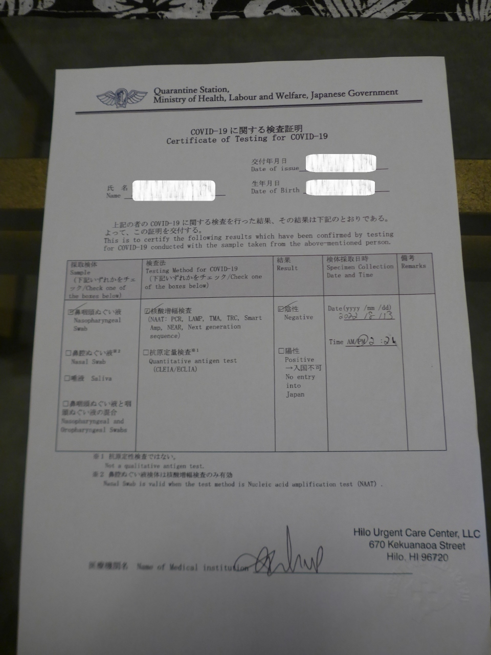 多くの検査機関が情報として増えてきていますがいつ検査結果が来るのかそれも72時間以内に確実にとなるとその場で検査結果が出て証明書取得までできる期間が望ましいと思いました。これからハワイ島に行かれる方も多いかと思いますが少しでも参考になればと思い直ぐ現地から本日の事を投稿しました。