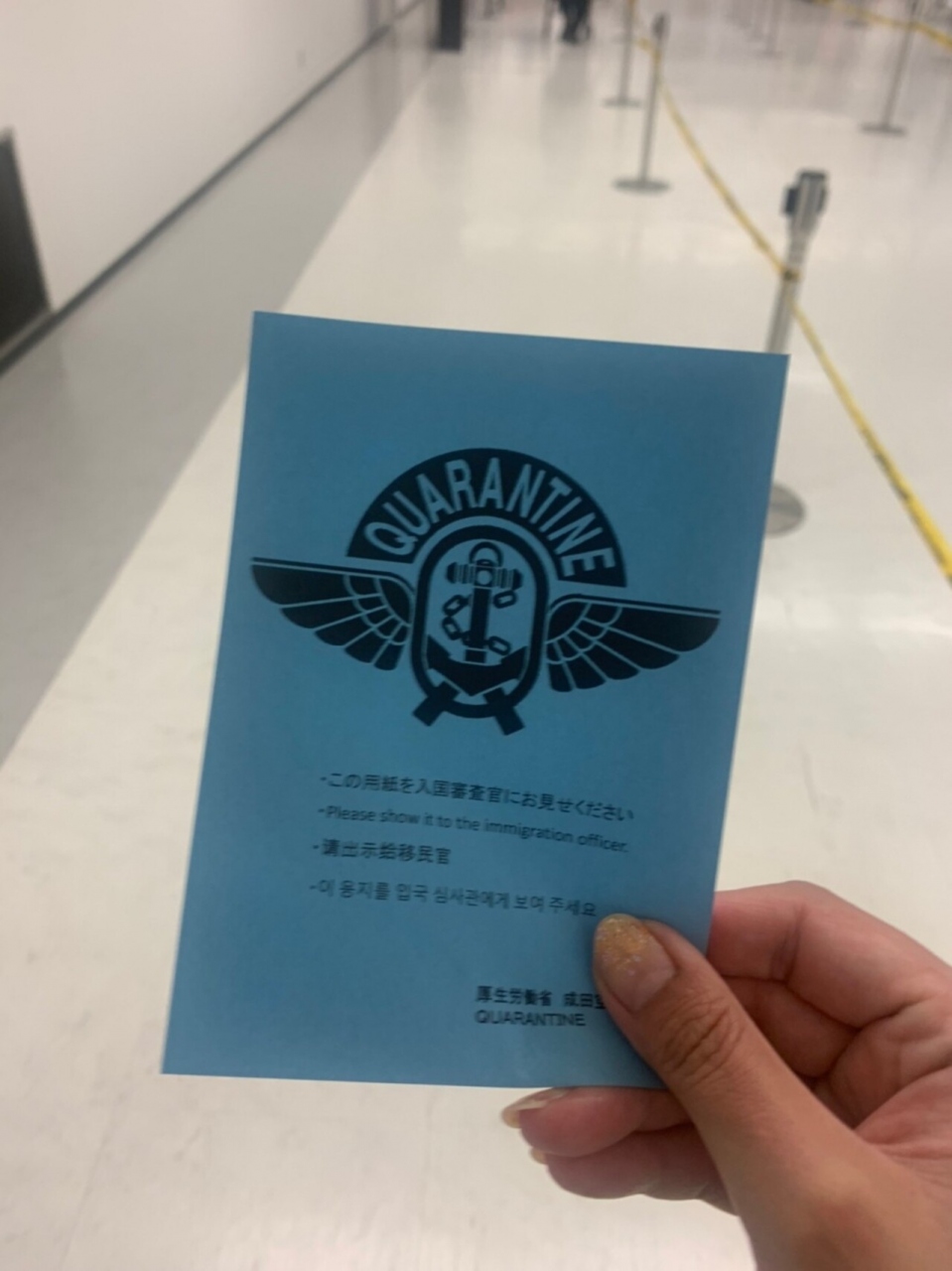 青色のA5サイズの紙を渡され紙には『quarantine(検疫)』と書かれていて