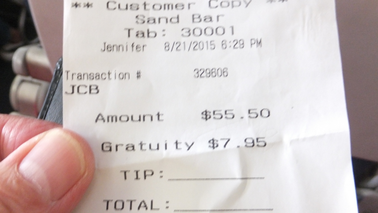 ここに、チップが15%なら幾ら、20%なら幾ら、25%なら幾らと載っていて、目安としては判りやすいです。