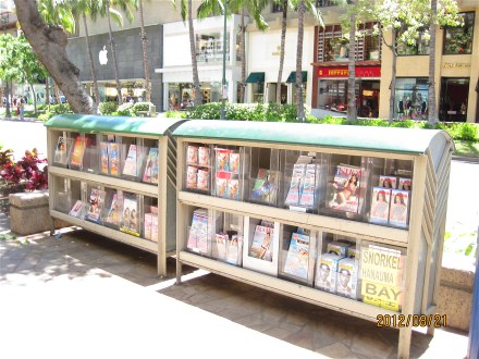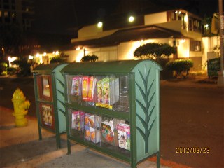 皆さんご承知のガイドブックが色々と置かれているボックス。置かれている場所によりボックスの外観の模様が違うのです。ほどんとがハワイの植物を表現していますね。