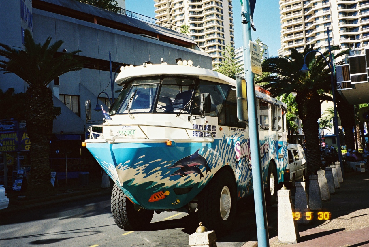 ゴールドコーストで乗った水陸両用車。 水に入るときは、バックで入りました。 そこをサービスで2回位やってくれたり。 とても盛り上がりましたよ。 今でもやってるかな?