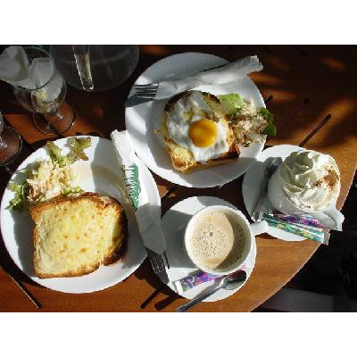 パークロイヤルホテルすぐ近くの、パームビーチショッピングセンター内にあるカフェ。これは朝ごはん。クロックマダム(チーズをはさんだトーストに目玉焼きがのっている)、クロックベーコン(ベーコンをトーストで挟んでいる)、カフェオレ、ウィナーなんとか(ココアにたっぷりの生クリーム!カプチーノ版もありました。名前はすみません)。とってもボリュームがあってしかも美味しい!ほかにも様々なメニューがあり、どれも美味しそうでした。夜にはアルコール類もありました。すぐそこにアンスバタビーチがあり、ランニングしている人や、散歩している人を眺めながらくつろいで頂けます。オープンテラスもあり、気持ちいいですよ。