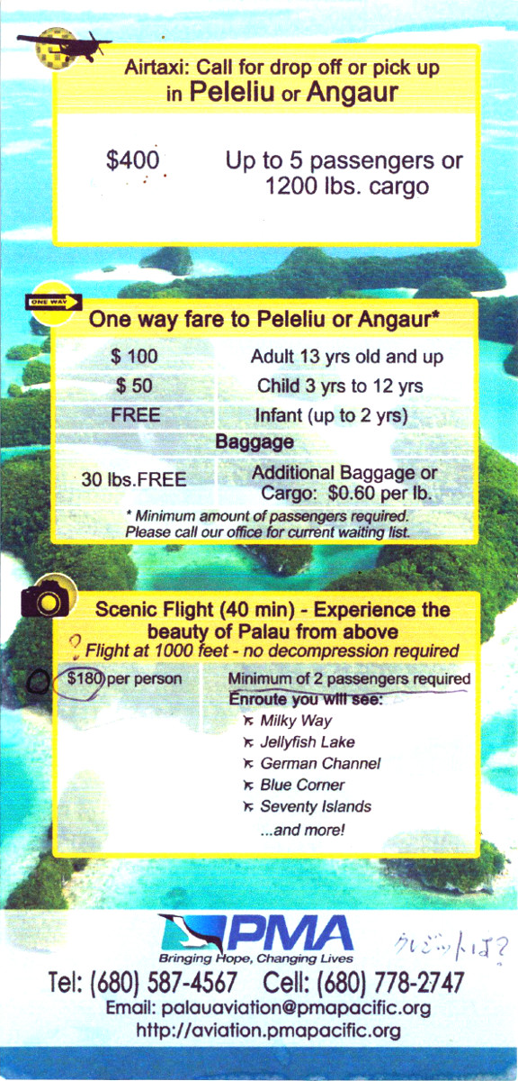 両島には旧日本軍が作った飛行場があります。 ペリリュー島へは高速ボートで60$でした、出発地から港までタクシー10$ 合計70$ それに対してセスナは100$です。最低必要人数あり。 (散らなかったので利用しなかった。 フィジーではマナ島から本島までヘリ を使い快適でした) 事前に知っておれば片道は絶対利用したでしょう。 運行会社 Pacific Mission Aviation TEL:(680)-587-4567 パンフ添付