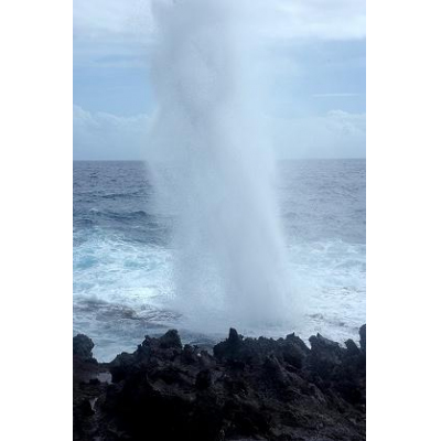 島の北部に今も残るエーブル滑走路の東側。黒いごつごつと切り立った岩の崖に押し寄せる波が、画像のように霧となって穴から吹き上がります。波の大きさと打ち寄せ加減で吹き上がり方が大きく違うので、あまり近寄らないほうがいいと思います。周辺の崖に寄せる波も、私たちが行った時には恐ろしいほど。カメラの防水にもご用心。