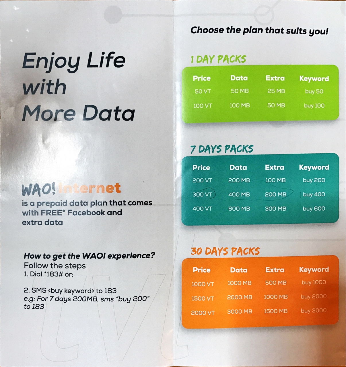 Digicelの一般的なプランは、”Visitor’s SIM”(VT1,000)。
