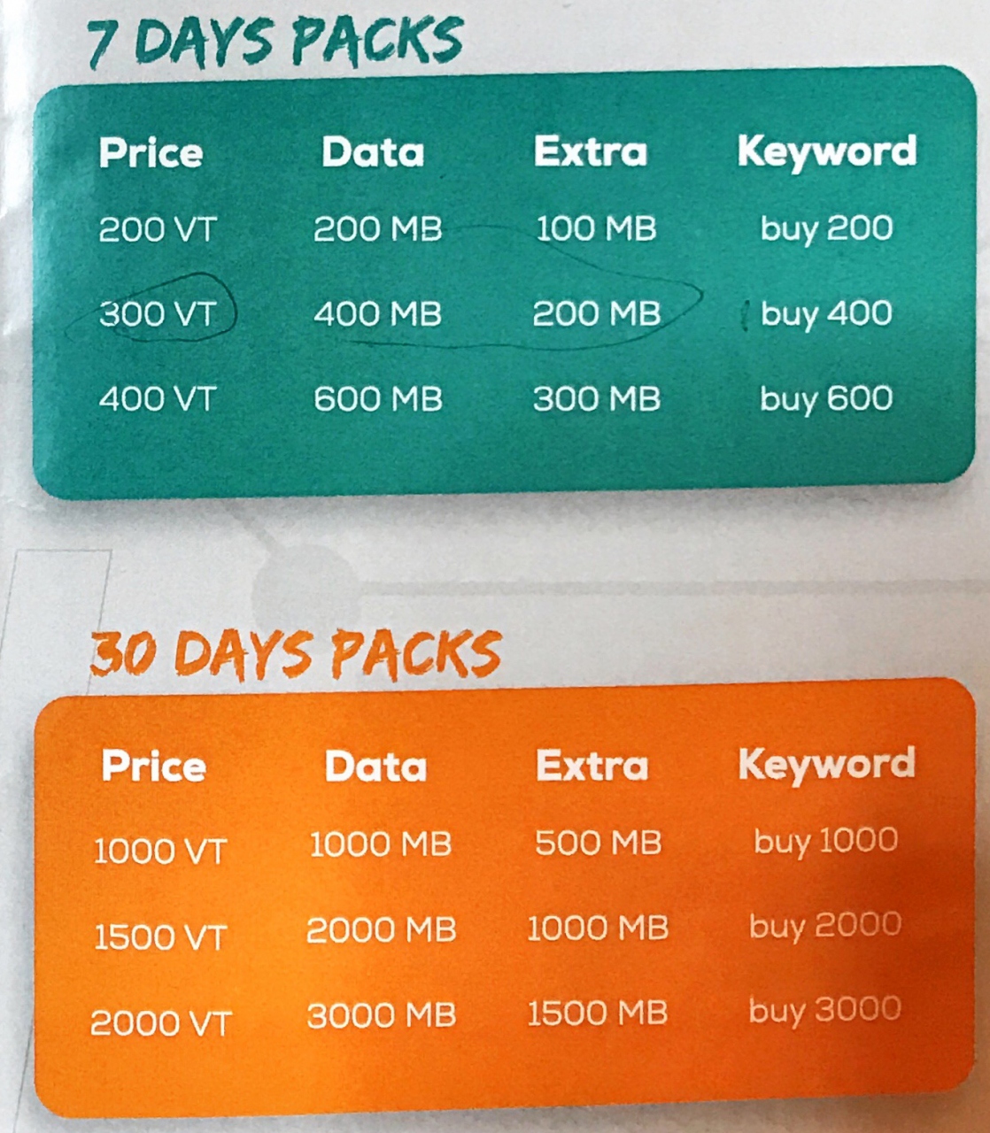 VT1,000の電話料金・各種プラン購入料金(3か月有効)と、500MBのデータ(1週間有効)が含まれています。