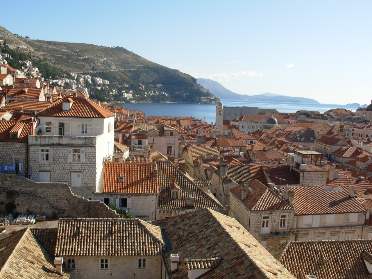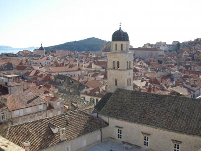 スルジ山からの眺めとは違い、近くから見る新しいオレンジ色の屋根と、歴史を感じさせる色あせたオレンジの屋根の織り成すモザイク模様が綺麗、そして遠くにそびえる鐘楼、そして其の向こうに青い海、青い空はまさに圧巻!!