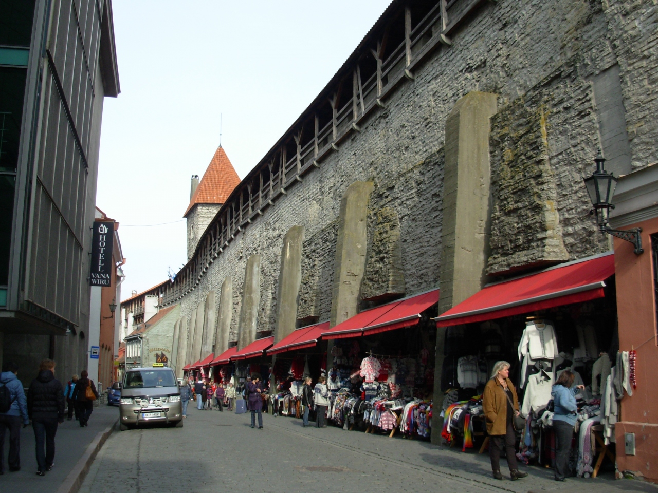 旧市街のメインストリートのヴィル通りとムーリヴァヘ通りの交差点付近の城壁沿いにへばりつくように並ぶ編物のお店。ずうっと延々と続いてきた昔ながらの編物の文化を感じさせる。私はその地で織られた布とか独特の柄を見るのが好きで、ここのセーターを買いたかったが、ちょっと高いのであきらめました。遠目に見るとずうっとつながってる日よけに使ってる紅い日ざしが城壁の黒っぽさとマッチし綺麗でした。