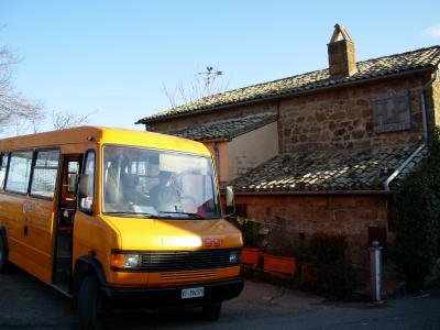 私のいったときは町の入り口から2キロ位てまえの比較的大きな駐車場でオレンジ色のバスに乗り換え両脇に 少し人家のある細い道を走り終点の町の入り口で下車。