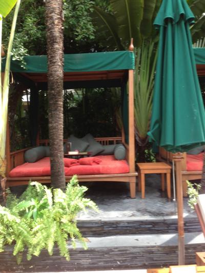 ホテル内のプールサイドで休んでいると、ライムが入ったお水と、冷たく気持ちの良いおしぼりが運ばれてきました。その後、ジュースと一口おつまみが運ばれ、とても美味しくいただきました。白い制服姿のプールボーイの方々がよく気遣いをしてくださっていました。