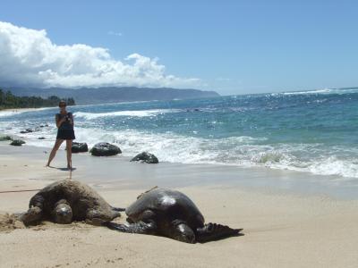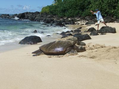 ウミガメが甲羅干しする為にビーチに上がって来る事で有名なラニアケア・ビーチ。。