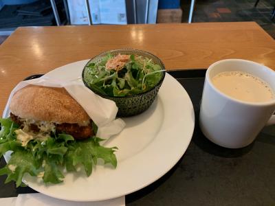 雑誌に載っていた、瀬戸内フィッシュバーガーとカフェオレを注文。(¥980)支払いはクレジットは使えないがPayPayは使える。サラダが付いている。雑誌ではタルタルソースがともて美味しいと書いてあったので期待して行ったが、そのタルタルソースがあまりにも少なくて非常に残念。次回は別のをオーダーするかな。