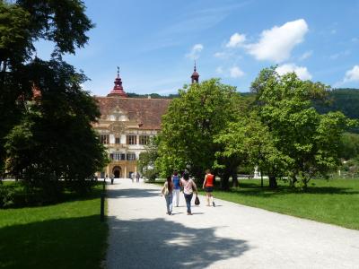 駅前またはハウプト広場から1番のトラムで20~30分、1番トラムの行先表示は、「Eggenberg」とありますが下車する停留所は終点ではなく、それより手前の「Schloβ Eggenberg」です。トラム車窓や停留所からは城の建物は見えません。停留所から少し戻って右側の通りを徒歩5分です。