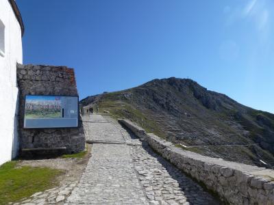 王宮北側の始発駅コングレス(乗場は地下)からケーブルカーに乗り、2本のロープウェイを乗り継いで一気に山頂駅に着きます。混雑状況にもよりますが、スムーズに行けば始発駅から40分程です。ロープウェイの山頂駅から30分程山の斜面を登れば、標高2334mのハーフェレカーの山頂に立つことができます。